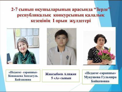 5 «А» сынып оқушысы Жақсыбаев Алижан-1 орын, жетекшілері Қонақаева З.Б. және Мукушева Г.Б.;