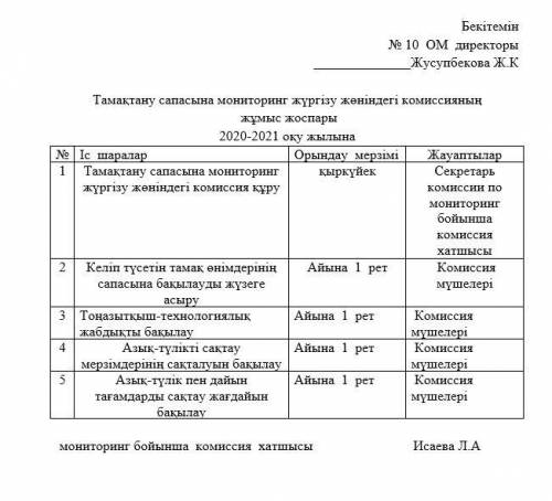 Тамақтану сапасына мониторинг жүргізу жөніндегі жұмыс жүргізу жоспары