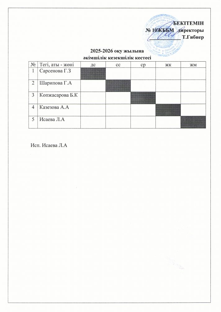 2025-2026 оқу жылына әкімшілік кезекшілік кестесі