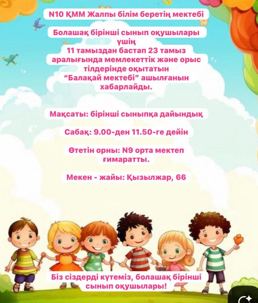 №10 КММ Жалпы білім беретің мектебі болашақ бірінші сынып оқушылары үшің 2025 жылғы 11-23 тамыз аралығында мемлекеттік және орыс тілдерінде оқытатын "Балақай мектебі" ашылғанын хабарлайды