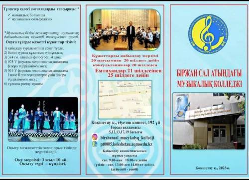 Біржан Сал атындағы музыкалық колледжі 2023-2024 оқу жылына талапкерлерді қабылдау туралы хабарлайды. Оқуға 9 сынып негізінде қабылданады. Оқыту мемлекеттік және орыс тілінде жүргізіледі. Оқу мерзімі: 3 жыл 10 ай. Оқыту түрі – күндізгі.