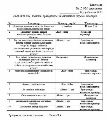 Бракеражды комиссияныж жұмыс жоспары