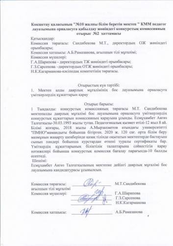 Көкшетау қаласының "№ 10 жалпы білім беретін мектеп" КММ педагог лауазымына орналасуға қабылдау жөніндегі конкурстык комиссиясынын отырыс №2 хаттамасы