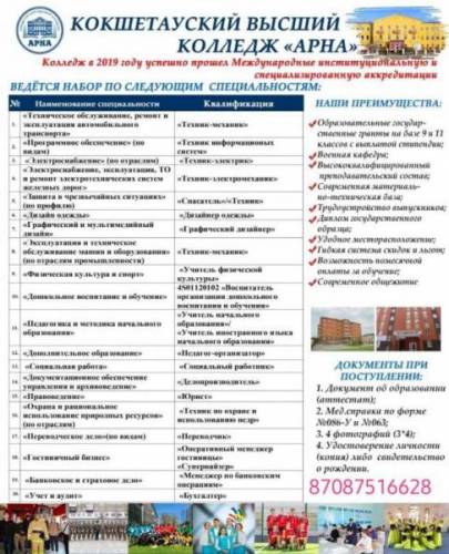 "Арна" Көкшетау жоғары колледжі 9-11 сыныптан кейін абитуриенттердің құжаттарын қабылдауды жүргізуді бастады.