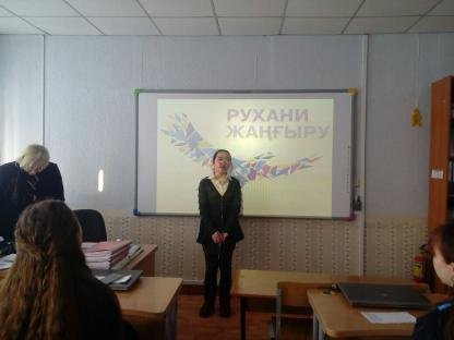 В рамках реализации программы «Рухани Жангыру» в 4Б классе учителем самопознания Рукгабер Л.С. было проведено внеклассное мероприятие «В единстве наша сила». В ходе мероприятия учащиеся ответили на вопросы викторины о Родине, собрали пословицы...
