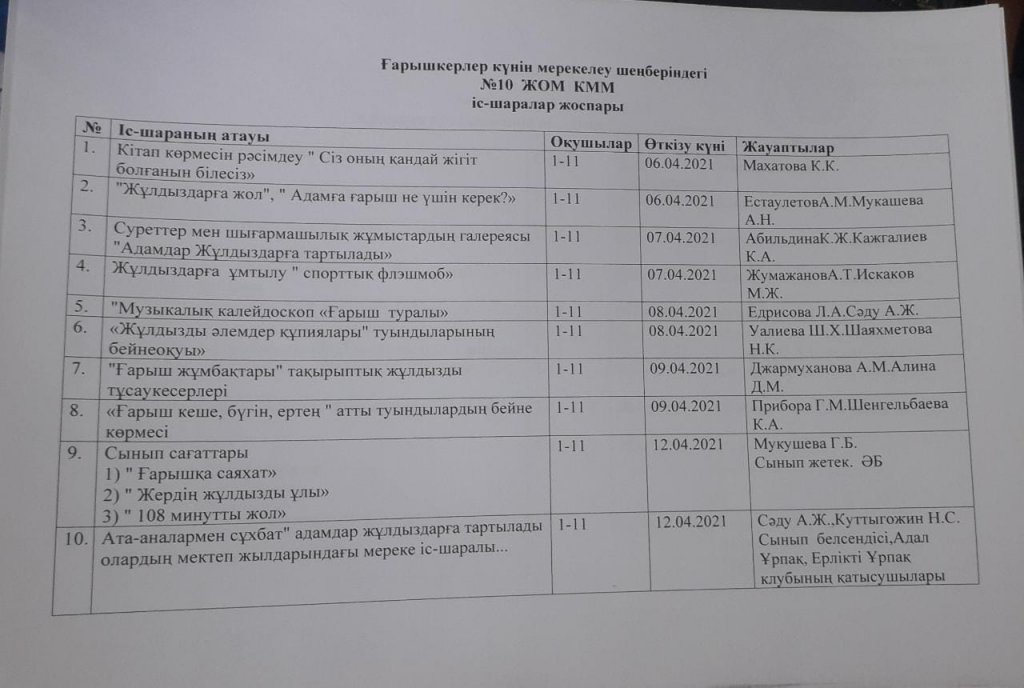 Ғарышкерлер Күнін мерекелеу шеңберіндегі жоспар
