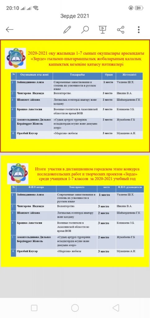 "Зерде" ғылыми- шығармашылық жобаларының қалалық қашықтық кезеңіне қатысу нәтижелері 1-7 сынып