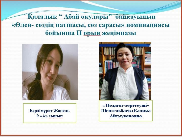 2022 жылдың 5 сәуір күні 8-11 сынып оқушылары арасында "Абай оқулары" атты Республикалық байқауының қалалық кезеңі өтті. Байқауға қатысып, ерекше өнер көрсеткендері үшін 9" А" сынып оқушысы Бердімұрат Жанель