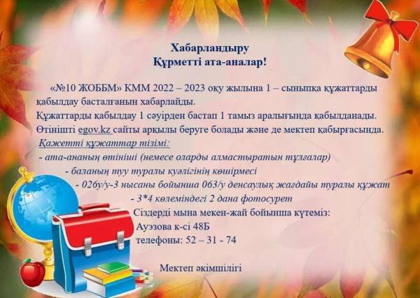 31 шілдеде 2022-2023 оқу жылына 1-сыныпқа құжаттарды қабылдау аяқталады