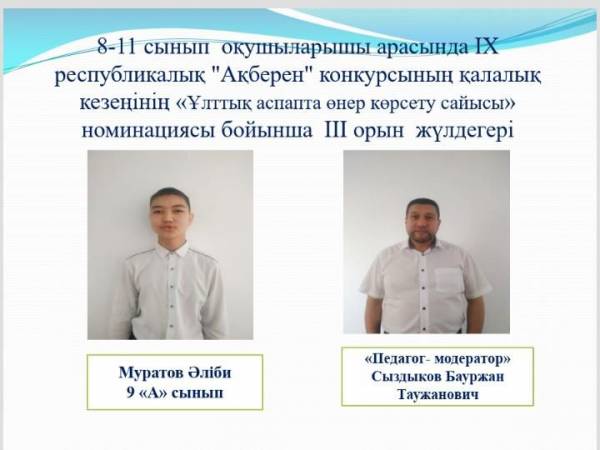 Ағымдағы жылғы 22 қыркүйек Әл-Фараби атындағы IT лицей базасында шығармашыл 8-11 сынып оқушылар арасында «Ақберен» республикалық өнер байқауының қалалық кезеңі өтті. Байқау қорытындысы бойынша «Көркемсөз оқу сайысы» номинациясы бойынша 9 «А» сынып оқушысы Бердімұрат Жанель 2 орынды, «Эссе жазу сайысы» номинациясы бойынша 9 «А» сынып оқушысы Сағындық Мерей 3 орынды, «Ұлттық аспапта өнер көрсету сайысы» номинациясы бойынша 9 «А» сынып оқушысы Муратов Әліби 3 орынды иеленді. Жетекшілері Шенгельбаева Калима Айтмукановна және Сыздыков Бауржан Таужанович.
