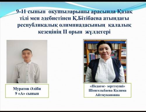 2023 жылғы 26 қаңтарында қала мектептерінің 9-11 сынып оқушылары арасында Қазақ тілі мен әдебиетінен Қ.Бітібаева атындағы республикалық олимпиадасының қалалық кезеңі өтті.Олимпиада қорытындысы бойынша ұ сынып оқушылары арасында мектебіміздің 9 «А» сынып оқушысы Муратов Әліби II орынды иеленді.Жетекшісі Шенгельбаева К.А.